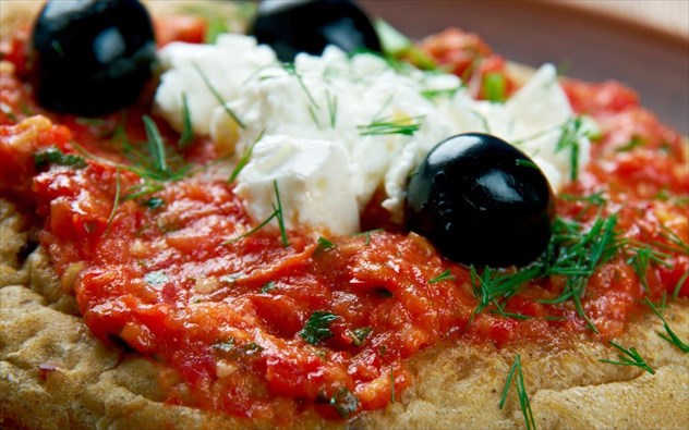 Ντάκος με 1 ντομάτα τριμμένη, 1 αγγουράκι , 60 γρ. ανθότυρο ή κατίκι Δομοκού, 5 ελιές, κάππαρη και ρίγανη
